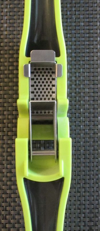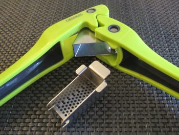 Reinigung : Die Reinigung unmittelbar nach der Verwendung ist einfach, was vor allem auf den herausnehmbaren Korb zurückzuführen ist. Nach der, allerdings hakeligen Entnahme des Korbes ist dieser leicht zu reinigen, weil er an einer Seite offen ist. Auch haben die Sieblöcher nur die geringe Höhe von etwa einem Millimeter, weswegen sich Reste des Pressgutes leicht entfernen lassen.