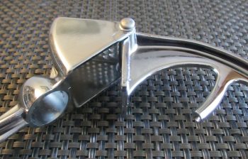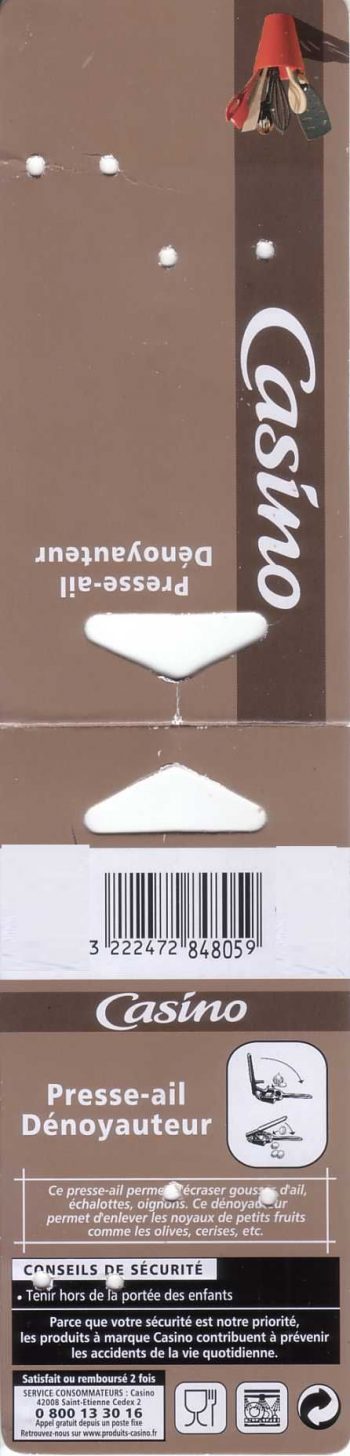 Gebrauch : Die auf der Innenseite mit quadratischen Graten umgebenen Sieblöcher tun ihre Wirkung: Der Knoblauch wird gleichsam ‘vorgeschnitten’ ehe er durch die Löcher gepresst wird.