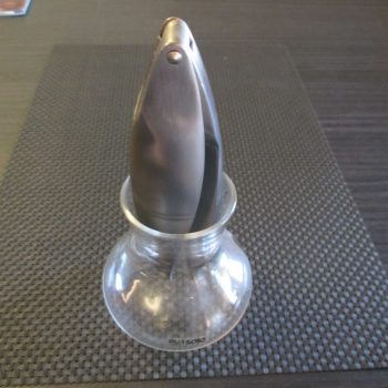 Gebrauch : Der Kraftaufwand beim Pressen ist erheblich. Das liegt am einerseits relativ großen Fassungsraum des Siebes, der auch große Knoblauchzehen aufzunehmen imstande ist, dem andererseits zu kurze Schenkel gegenüber stehen (Hebelgesetz!). Überhaupt muss gesagt werden, dass die Presse, so elegant das Design auch anmutet, ergonomisch nicht wirklich gut in der Hand liegt.