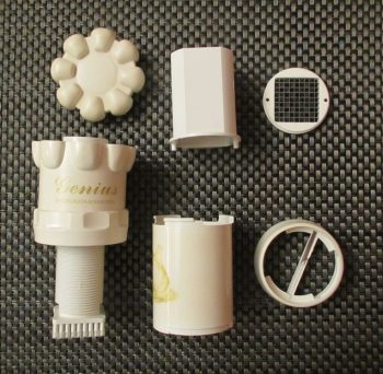 Nicht zuletzt zu Reinigungszwecken lässt sich das Gerät zerlegen, wobei für den anschließenden Zusammenbau eine gewisse Geschicklichkeit und ein wenig technisches Verständnis von Vorteil sind. Das Bild des zerlegten Gerätes und die schematische Skizze der Einzelteile veranschaulichen diesen Umstand.