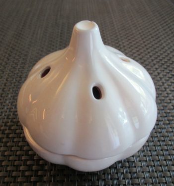 Anmerkungen : Dieses Objekt wurde nur ausnahmsweise in die Sammlung aufgenommen: Es handelt sich ja keinesfalls um ein Knoblauchbearbeitungsgerät. Aber sowohl die Form (Knoblauch) als auch der Verwendungszweck (Aufbewahrung von Knoblauch) passen doch recht gut zum Thema der Sammlung.