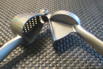 Gebrauch : Weil die Stempelfläche bei dieser Presse eher groß ist, muss, auch abhängig von der Konsistenz der Knoblauchzehe(n), mehr Druck als üblich ausgeübt werden. Auch tritt wegen der ungenauen Passform des Stempels eine geringe Menge des Fruchtfleisches am Stempel vorbei nach oben aus.