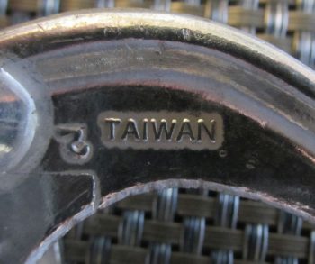 Auf einer Seite eines Griffes findet sich die erhabene Prägung TAIWAN (kleines Bild) und die Ziffer 2, am anderen Griff steht die Ziffer 3. Diese Ziffern sind Kennungen der Gießerei.