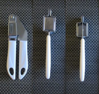 Anmerkungen : Design und Funktionalität entsprechen vielen vergleichbaren Modellen dieses Quasi-Standards bei Knoblauchpressen. Das gilt allerdings nicht für die Griffe.
