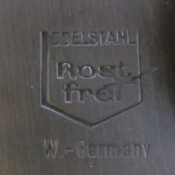 Auf einem Griff ist das Logo des Herstellers in Siebdruck zu sehen (kleines Bild). Darüberhinaus findet sich auf einer Seite der Stempelhalterung die Prägung EDELSTAHL rostfrei und W.-Germany (kleines Bild).