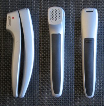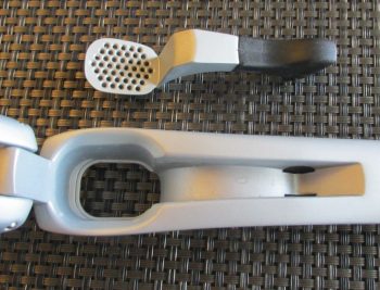 Gebrauch : Die Presse liegt angenehm in der Hand, der Kraftaufwand nicht übertrieben hoch. Allerdings müssen wohl die meisten Knoblauchzehen wegen des kleinvolumigen Korbes zerteilt werden. Ab der zweiten oder dritten Pressung treten auch halb zerquetschte Knoblauchreste am Stempel vorbei nach oben.