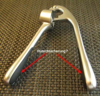 Ein interessanten Detail sind die Rutschsicherungen an den Griffen (kleines Bild). Sie sind nämlich nicht dort, wo sie eventuell benötigt würden, sondern an der Innenseite der Griffe. Was sich der Designer dieses ansonstig wertig wirkenden Gerätes dabei gedacht hat kann nur vermutet werden: Eventuell nichts?