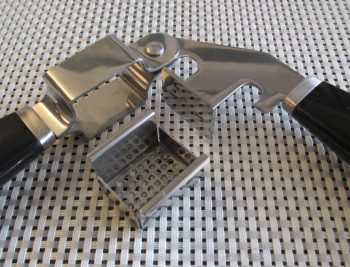 Gebrauch : Beim Pressvorgang kann, wie bei allen Geräten dieses Typs, nicht die gesamte Zehe durchgedrückt werden. Es bleibt ein nicht geringer Teil im Korb – zwar gequetscht, aber nicht durchgedrückt – zurück. Dieses Pressgut muss dann manuell herausgekratzt werden.