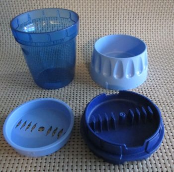 Gebrauch : Wenn die geschälten Knoblauchzehen nicht allzu groß sind müssen sie nicht zerteilt werden. Durch drehende Hin- und Herbewegung wird der Knoblauch zermatscht, je länger desto kleiner werden die Teilchen. Durch Wenden der Platte (dunkelblau, kleines Bild vorne rechts) kann die Granularität beeinflusst werden. Allerdings, unter eine bestimmte Granularität kann nicht gegangen werden.