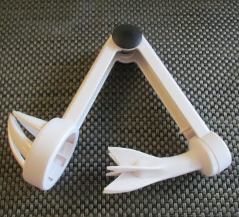 Werden die beiden Schenkel vollständig zusammengedrückt rasten sie ein und das Objekt kann so platzsparender verstaut werden.