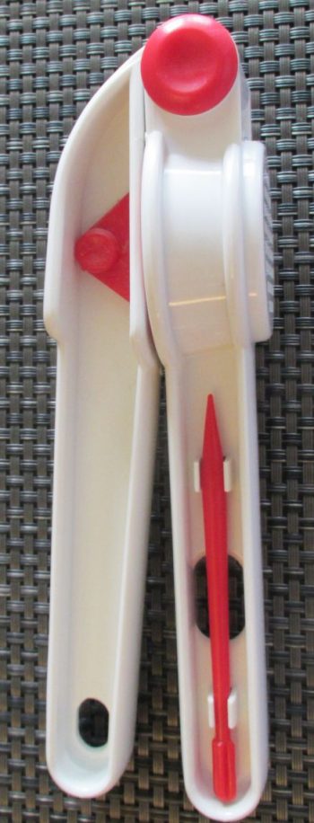 Die Presse verfügt über einen eingesteckten Stössel (kleines Bild) mit kreisförmigem Querschnitt, der wahrscheinlich zur Reinigung der allerdings viereckigen Sieblöcher gedacht ist. Da der Durchmesser des Stössel auch noch größer ist als der der Sieblöcher ist Reinigungserfolg zweifelhaft.
