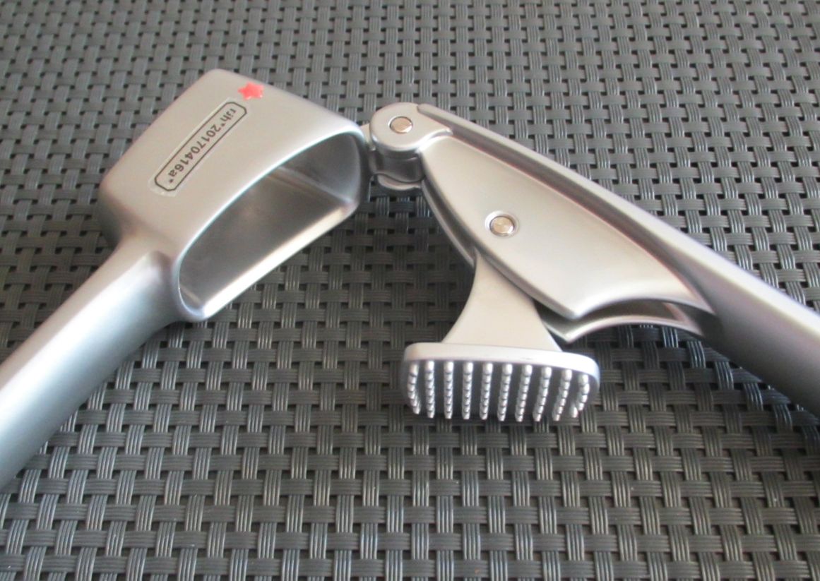 Gebrauch : Zwar ist, auch wegen der eher kleinen Sieblöcher, ein gewisser Kraftaufwand nötig um die Presse zu bedienen, das Pressergebnis ist aber zufriedenstellend. Nur ganz wenig Knoblauch tritt am Stempel vorbei zur Seite. Und auch die zweite und folgende Zehen können ohne vorherige Reinigung des Siebkorbs verarbeitet werden. Dafür sorgen die Noppen am Stempel, die den Großteil des Materials durch die Löcher befördern.