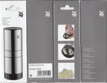 Gebrauch : Die Bedienung dieses Gerätes ist recht herausfordernd. Es müssen zwei Zylinder mit glatter Oberfäche gegeneinander in einer Richtung verdreht werden. Um eine durchschittlich große Knoblauchzehe in Würfel zu zerlegen sind etwa zehn Umdrehungen nötig.